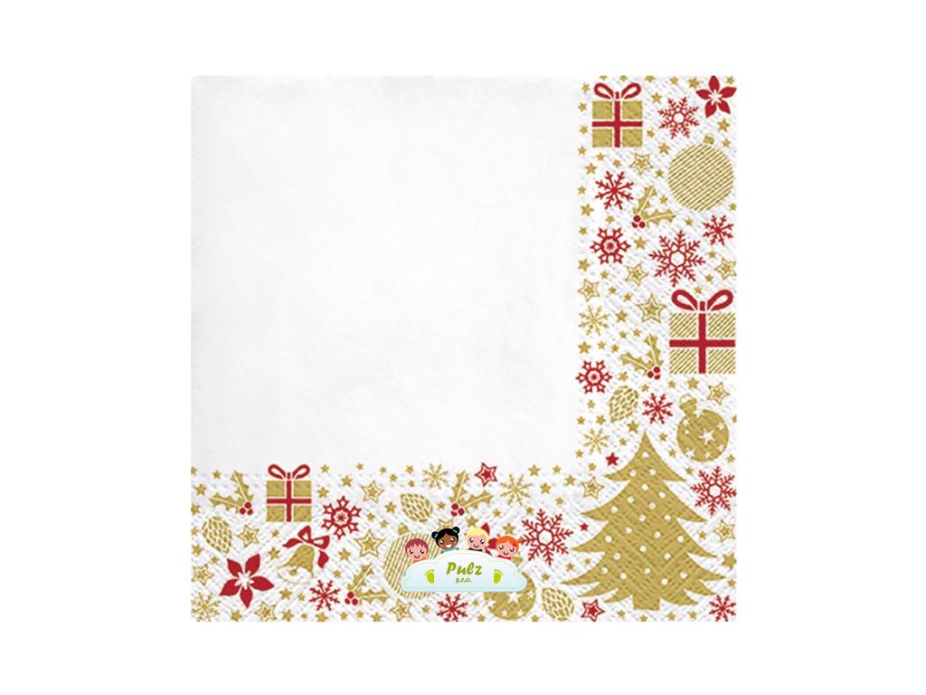 Papírový vánoční ubrousek s motivem vánočních symbolů, jako jsou dárky, stromečky, vločky a ozdoby. Tyto prvky jsou uspořádány kolem tří rohů, zatímco zbytek ubrousku zůstává bílý, což vytváří elegantní a čistý vzhled. Je vyroben z velmi kvalitního třívrstvého papíru. Tento ubrousek můžete využít při slavnostním stolování během vánočních svátků. Kromě toho může sloužit i jako dekorativní prvek při aranžování vánočních dekorací.