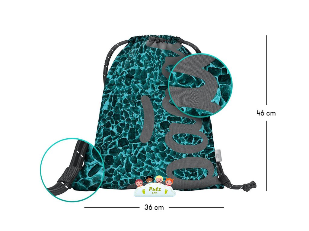 Je vyroben z odolného a omyvatelného polyesterového materiálu, který snadno zvládne každodenní používání. Zavírání je řešeno pomocí pevných tkanic, které zároveň umožňují pohodlné nošení sáčku na zádech jako batoh.