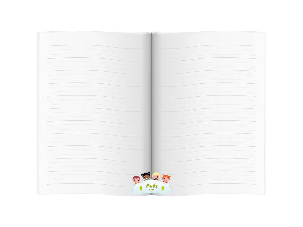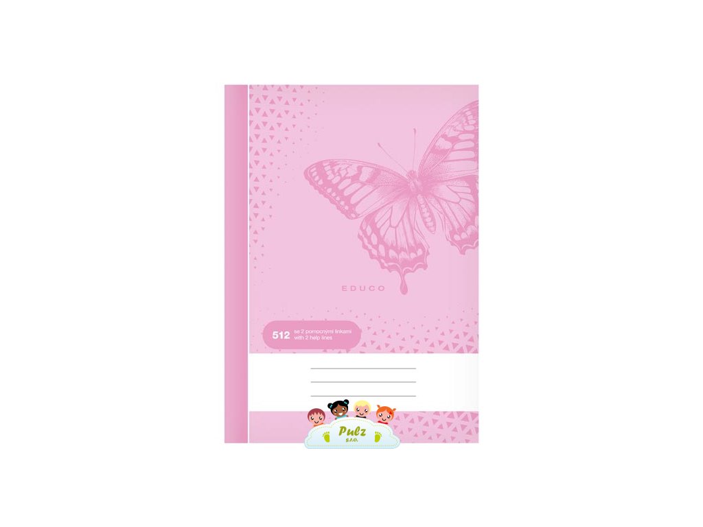 Školní linkovaný sešit ve formátu A5, v růžové barvě, s motivem motýla, v deskách z křídového papíru. Sešit je vhodný především pro prvňáčky, kteří se začínají učit psát. S tím jim pomohou 2 pomocné linky. Stránky jsou bez okrajů.
