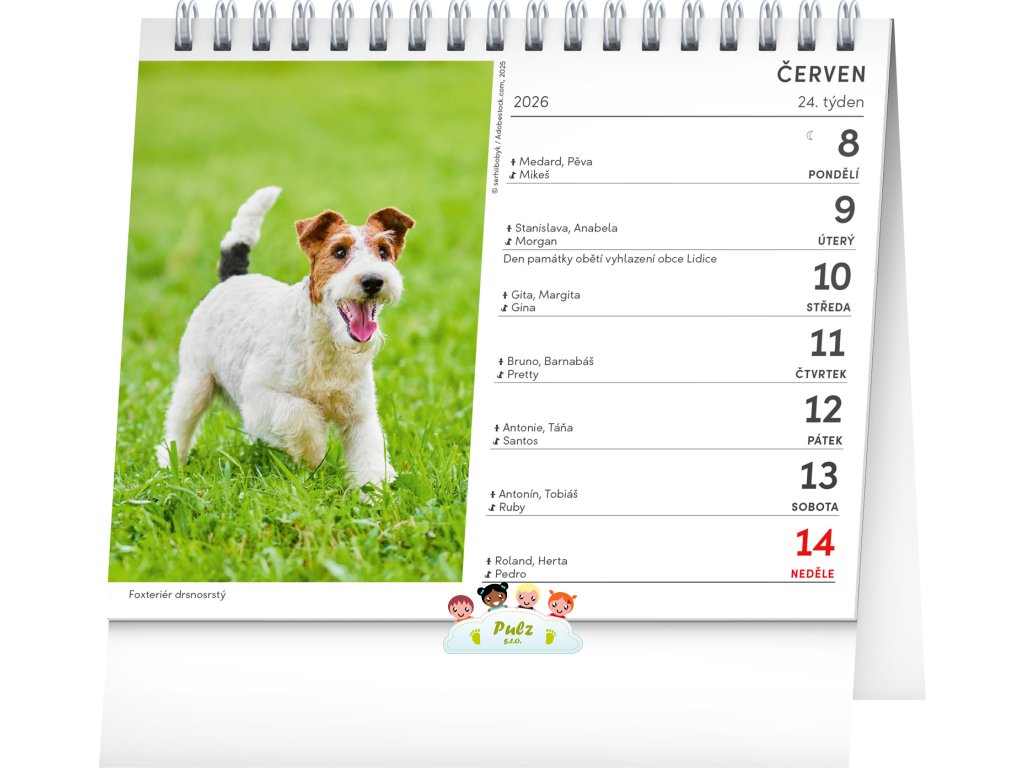 Stolní kalendář Psi – se jmény psů 2026, 16,5 x 13 cm