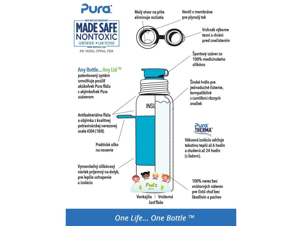 Konečně bezpečná láhev vyrobená 100% bez plastových částí. S Pura lahvemi si můžete být jisti, že se do nápoje uvnitř neuvolňují žádné škodlivé látky atoxiny, ani příchutě a pachy jako je tomu u plastovýchlahví nebo lahví s plastovými víčky. Na ničem nezáleží více než na zdraví Vašich dětí a Vás.